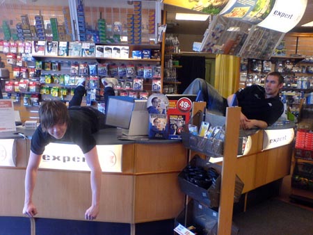 15:03 fick Niklas för sej att han skulle gå på Domus toa bak på lagret, det hela slutade med att han blev inlåst eftersom varuhuset stängde och vi fick ringa Securitas som släppte ut honom.