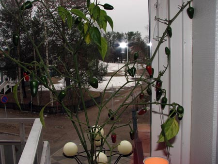 En av mina chili-plantor har fått för sej att det är höst, den har tappat alla bladen och är full med frukter, jag smakade på en av dom som blivit röda, det var knappt att jag pallade det, hehe, jag fick hicka.