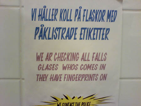 Jag har suttit och kikat igenom min telefon och hittade den här fantastiska bilden. Domustanterna vill tydligen vara internationella och berätta att dom ringer snuten ifall det är något skumt med "höstarnas felstavade glas" eller något sånt.