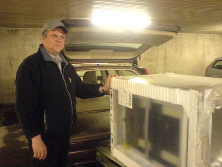 Mitt i allt kom det en gubbe från posten och bad mej skriva på att jag mottagit en spis, jag fattade som vanligt inte något men gjorde som han sa, det visade sej att det var Kenken som skulle ha den så vi pressade in den i hans V70, som Kenken sa "vilken våååldsam packåsna va?"