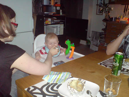 Bakad potatis a´la Pethra tillsammans med Wille och Alfred, Affe ville inte smaka idag men sist var det en rejäl höjdare så han tog en portion morotspuré istället.