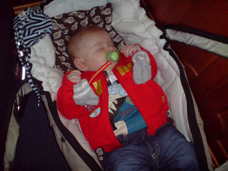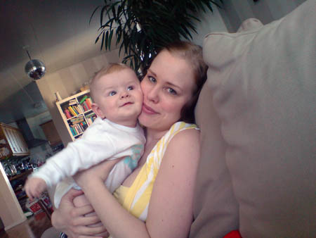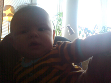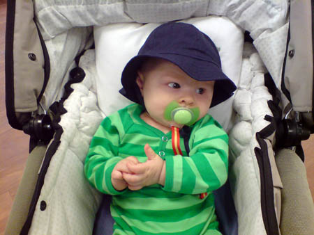 En cool liten kille i pyjamas och sommarhatt kom och hälsade på mej på jobbet idag, Chrille pussade honom och tyckte att allt tar sån jävla tid nu sen jag blivit farsa.